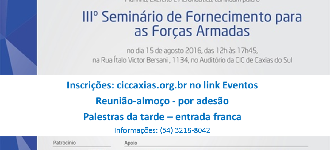 As inscrições para o seminário são gratuitas e podem ser feitas no site da CIC. Já a reunião-almoço é por adesão, e as inscrições também são por meio do site da entidade. Informações pelos telefones (54) 3218-8042 / (51) 3347-8846.