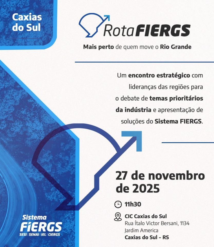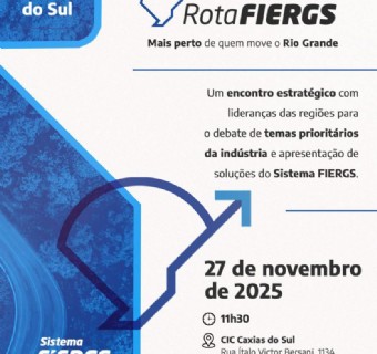 Nessa quinta-feira (27), o projeto Rota FIERGS chega à região da Serra. A iniciativa, realizada desde maio, promove a interiorização do Sistema FIERGS, com o objetivo de fortalecer sua atuação junto às indústrias do Rio Grande do Sul. O encontro entre representantes da entidade, sindicatos e lideranças regionais ocorrerá na Câmara de Indústria, Comércio e Serviços (CIC) de Caxias do Sul, a partir das 12h.