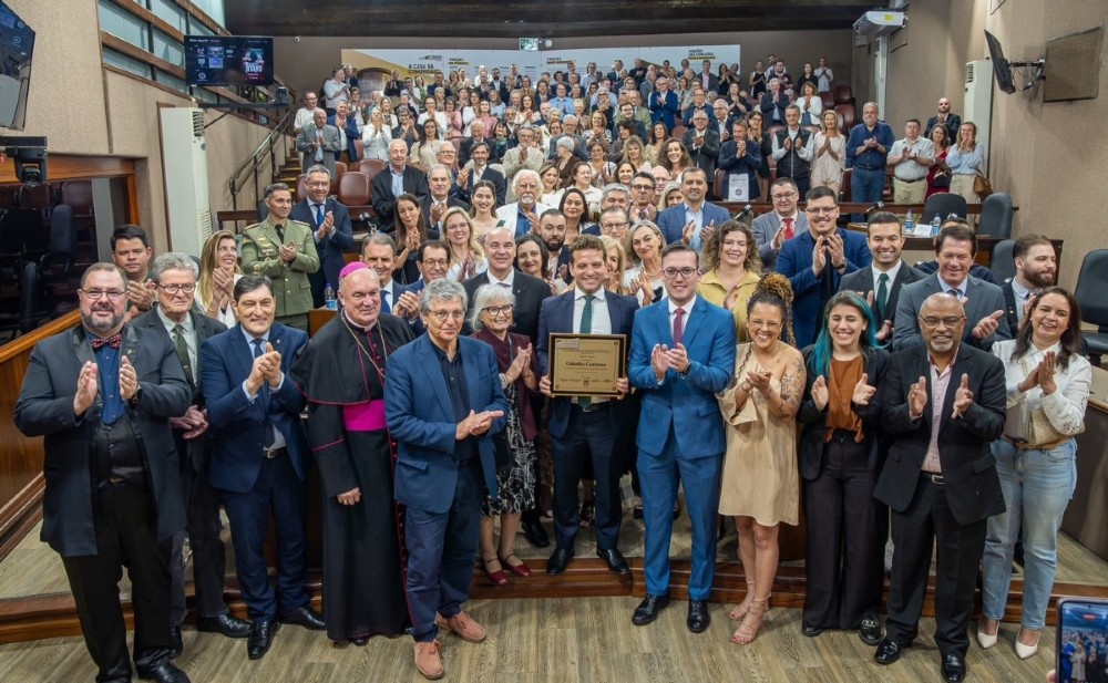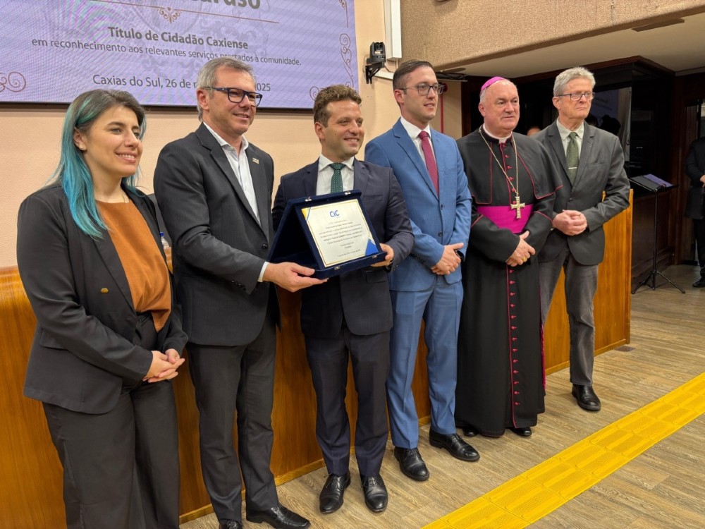 Agora, um cidadão caxiense. Engajado à Região da Serra e ao município por todo o trabalho nos últimos três anos, o cônsul-geral da Itália no Rio Grande do Sul, Valerio Caruso, recebeu o título em evento realizado na noite desta quarta-feira (26), na Câmara de Vereadores. A proposição foi do vereador Alexandre Bortoluz. A Câmara de Indústria, Comércio e Serviços de Caxias do Sul (CIC Caxias) também prestou homenagem ao diplomata, a quem o presidente da entidade, Celestino Oscar Loro, fez a entrega de uma placa em reconhecimento à sua atuação.