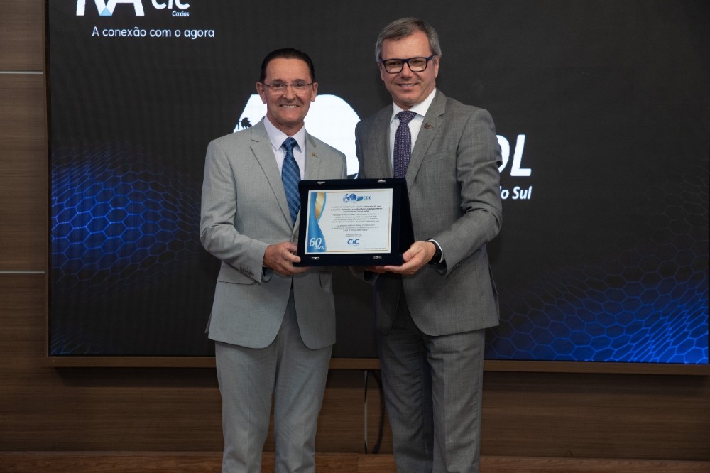 A R.A (reunião-almoço) desta segunda-feira (1º), promovida pela Câmara de Indústria, Comércio e Serviços de Caxias do Sul (CIC Caxias), marcou a celebração dos 60 anos da Câmara dos Dirigentes Lojistas (CDL) de Caxias do Sul. No encontro, o presidente da entidade, Celestino Oscar Loro, entregou ao presidente da CDL, Mauro Andreazza, uma placa alusiva às seis décadas da entidade, que reúne cerca de seis mil associados dos setores de comércio e serviços.